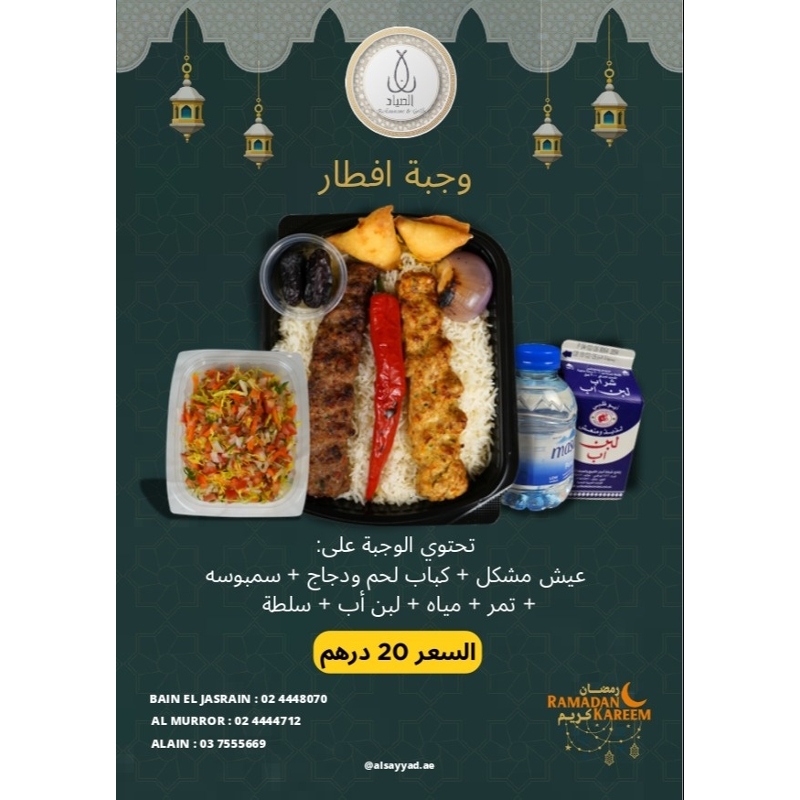 وجبة إفطار ( كباب لحم و دجاج ) In stock AED 20.00 عيش + كباب لحم و دجاج + سمبوسة + تمر + مياه + حليب + سلطة Quantity Add to cart Buy now