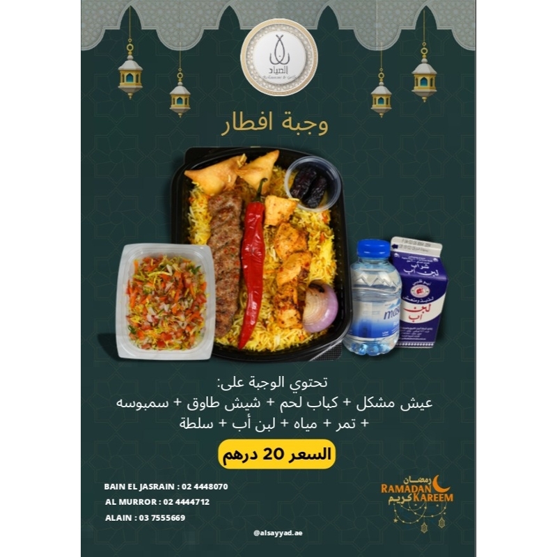 وجبة إفطار ( كباب لحم و شيش طاووق ) In stock AED 20.00 عيش + كباب لحم + شيش طاووق + سمبوسة + تمر + مياه + حليب + سلطة Quantity Add to cart Buy now