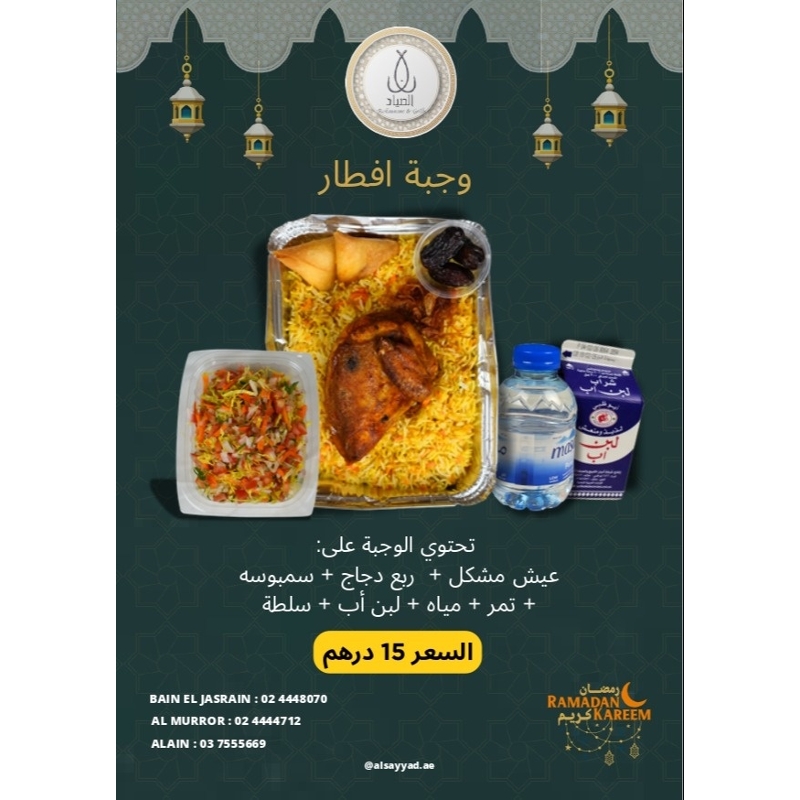 ( وجبة إفطار ( ربع دجاج In stock AED 15.00 عيش + ربع دجاج + سمبوسة + تمر + مياه + حليب + سلطة Quantity Add to cart Buy now
